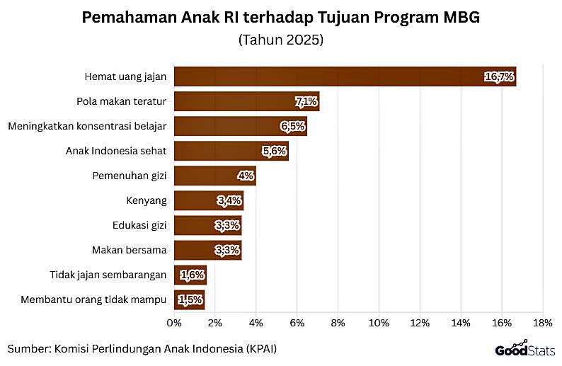 Lebih lanjut, 6,5% responden merasa tujuan MBG adalah untuk membantu meningkatkan konsentrasi belajar, disusul membentuk anak Indonesia yang sehat (5,6%), membantu pemenuhan gizi (4%), dan membuat kenyang (3,4%).