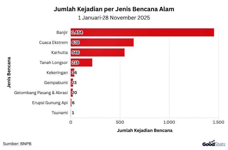 Jika melihat data BNPB, banjir tercatat sebagai bencana dengan jumlah kejadian tertinggi sepanjang tahun 2025, yakni mencapai 1.454 kejadian (49,42%), disusul cuaca ekstrem yang memicu angin kencang, hujan lebat, dan puting beliung sebanyak 638 kejadian (21,69%).