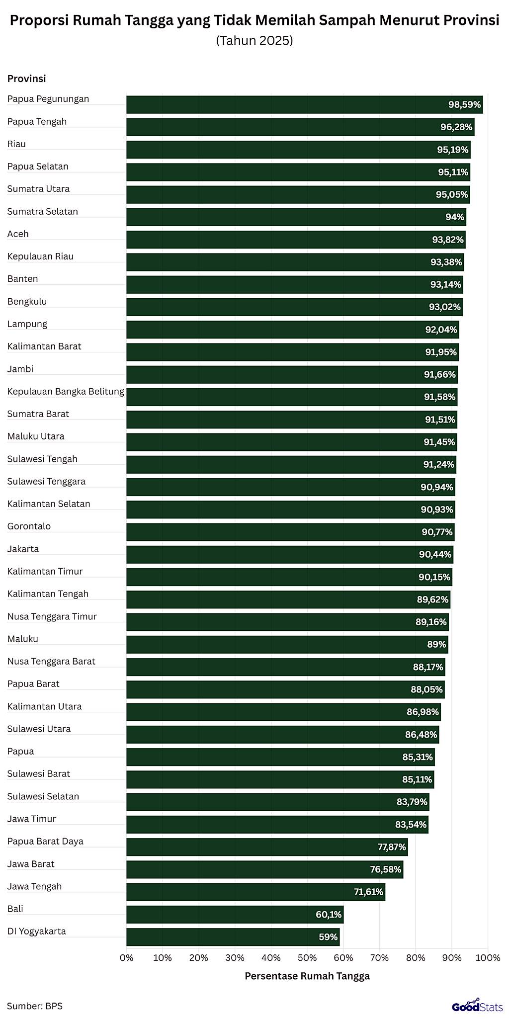 Sementara itu, perilaku pemilahan sampah di Indonesia masih sangat timpang antarprovinsi. Papua Pegunungan tercatat sebagai wilayah dengan proporsi rumah tangga tidak memilah sampah tertinggi, yakni mencapai 98,59%. Disusul Papua Tengah (96,28%), Riau (95,19%), Papua Selatan (95,11%), dan Sumatra Utara (95,05%).