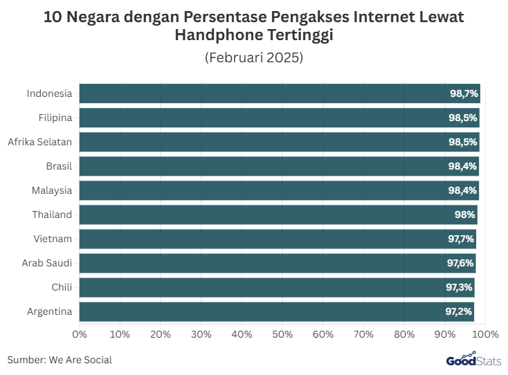 Berdasarkan laporan We Are Social bertajuk Digital Overview Report pada Februari 2025, Indonesia menempati posisi puncak negara dengan pengakses internet terbanyak lewat handphone dengan persentase mencapai 98,7%.