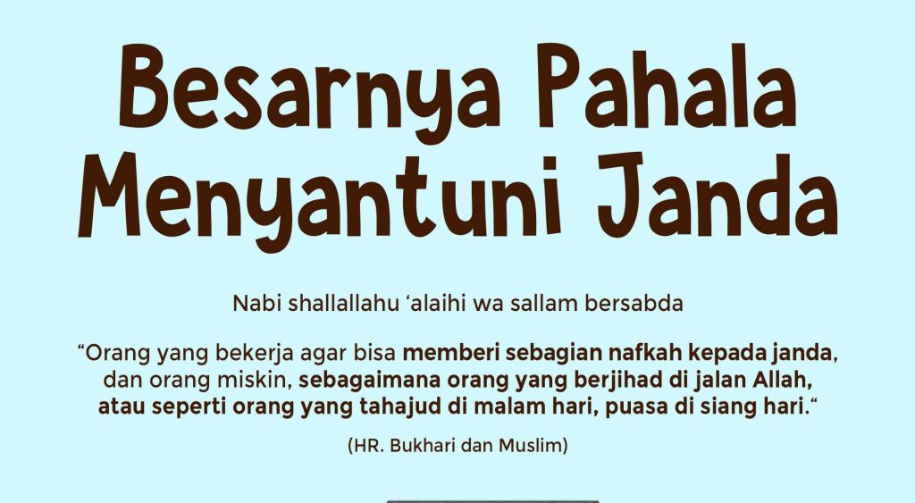 “Orang yang membantu para janda dan orang miskin adalah seperti orang yang berjihad di jalan Allah atau seperti orang yang selalu mengerjakan shaum di siang hari dan shalat di malam hari.” (Muttafaq ‘Alaih)