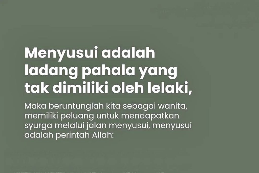 Rasulullah saw bersabda, “Ketika seorang wanita menyusui anaknya, Allah membalas setiap isapan air susu yang diisap anak dengan pahala memerdekakan seorang budak dari keturunan Nabi Ismail, dan manakala wanita itu selesai menyusui anaknya malaikat pun meletakkan tangannya ke atas sisi wanita itu seraya berkata, ‘Mulailah hidup dari baru, karena Allah telah mengampuni semua dosa-dosamu.’”